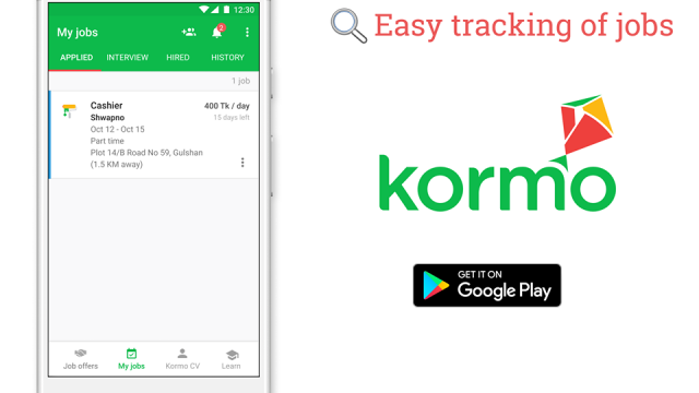 আমি আজকে যে অ্যাপ টা নিয়ে কথা বলছি সেটার নাম kormo। kormo একটি জব ম্যাচিং এন্ড্রয়েড অ্যাপ। kormo এর মাধ্যমে আপনার স্মার্টফোনে মাত্র কয়েকটি ট্যাপের মাধ্যমে আপনার জন্য উপযুক্ত কাজগুলো খোঁজা শুরু করতে পারবেন, যা আপনার ক্যারিয়ারকে এগিয়ে নিতে সাহায্য করবে।