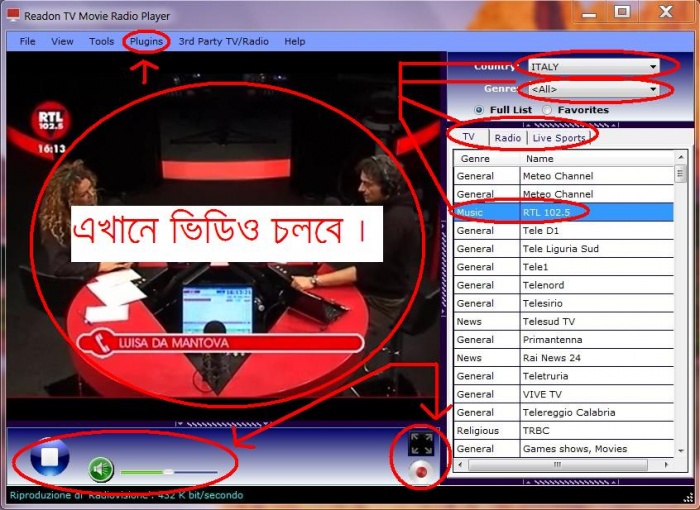 চ্যানেল এর নামে ডাবল ক্লিক করলেই ভিডিও চলবে । প্লাগিন সেটআপ না থাকলে প্লাগিন্স এ ক্লিক করে সেটআপ করে নিন ।