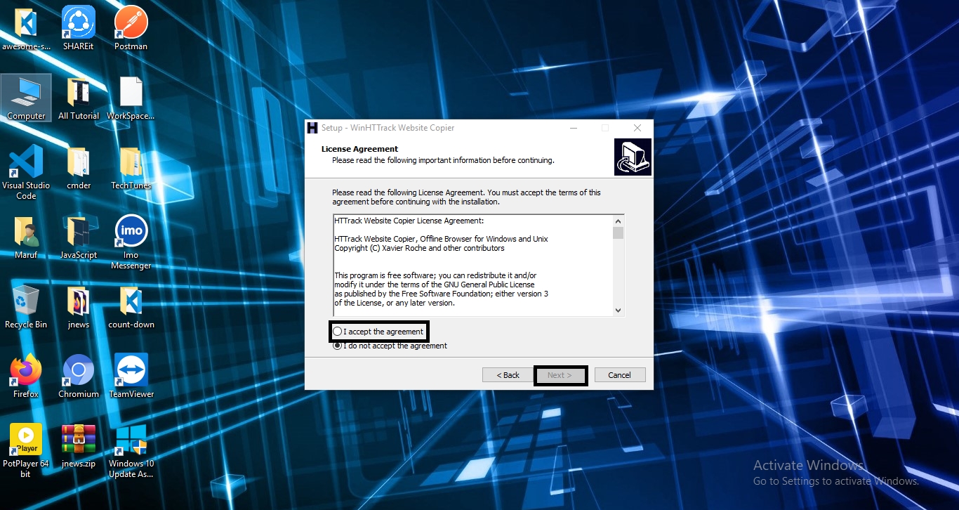 এখানে আপনার কাছে তাদের নিয়ম গুলোর অনুমতি চাইবে এর জন্য আপনি I accept the agrement এই রেডিও বাটনে ক্লিক করবেন। এবং Next বাটনে ক্লিক করবেন।