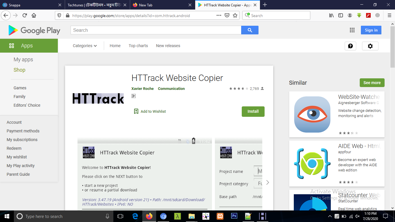 মোবাইলে অ্যাপটি ডাউনলোড এবং ইনস্টল করা একেবারেই সহজ। প্রথমে আপনি আপনার ফোনে থাকা প্লে স্টোরে চলে যাবেন। তারপর সার্চ বারে গিয়ে সার্চ করবেন httrack website copier। তাহলে নিচের মতো একটি অ্যাপ দেখতে পাবেন।