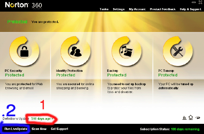 # এখন Norton360 Antivirus টি Update করে নেন । Antivirus টি Update করে নিলে ভাল হয়। না করলে সমস্যা নেই। যে ভাবে Update করবেন। প্রথমে Norton360 Antivirus টি Open করে বাম পাঁশে নিচে ( নাম্বার ২ মার্ক করা ) Run LiveUpdate এ ক্লিক করে Norton360 Antivirus টি Update করে নেন। তাহলে ( নাম্বার ৩ মার্ক করা ) Definitions Update: এর সময় টা যখন Update শেষ হবে তখন থেকে ৬ মাস এর মেয়াদ হবে।