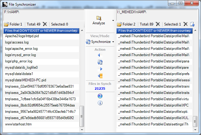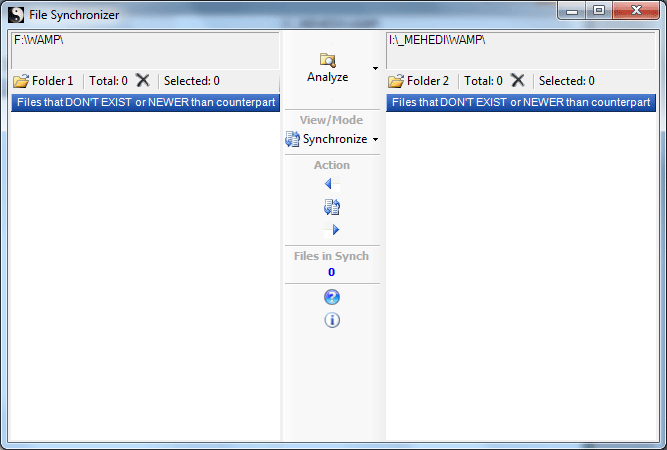 প্রথমে সফটওয়্যারটি রান করুন। ওপেন হলে ২টি সেকশন দেখতে পাবেন। ছবিতে দেখুন। ফোল্ডার ১-এ ক্লিক করে একটি ফোল্ডার ব্রাউজ করে দেখিয়ে দিন সিনক্রোনাইজ করার জন্য। একইভাবে ফোল্ডার ২-এ ক্লিক করে আর একটি ফোল্ডার ব্রাউজ করে দেখিয়ে দিন সিনক্রোনাইজ হওয়ার জন্য। যেমন আমি করেছি - 1. F:\WAMP (ল্যাপটপ) এবং 2. I:\_MEHEDI\WAMP (পেনড্রাইভ)। তারপর Analyze-এ ক্লিক করে সাবমেনু থেকে Analyze বাটনে ক্লিক করেছি। আর এ কাজটি করার পর সফটওয়্যারটি ব্রাউজ করা ফোল্ডার ২টি read করবে।