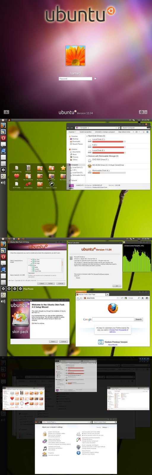 আমরা অনেকেই উইন্ডোজ 7 এ বিভিন্ন থিম ইউজ করি, আজকে আপনাদের সাথে পরিচয় করিয়ে তেমনি একটি থিমের। এটি মুলত একটি transformation packযা আপনার উইন্ডোজ 7 কে পুরোপুরি উবুন্টু ১১.০৪ এর রুপ দিবে, কিন্তু কাজে-কর্মে উইন্ডোজ 7 ই থাকবে