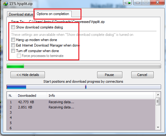 Hang up modem when done: মানে হলঃ যখন ডাউনলোড শেষ হয়ে যায় তক্ষণ আপনার পিসি অন থাকবে কিন্তু ইন্টারনেট ডিস্কানেক্ট হয়ে যাবে।