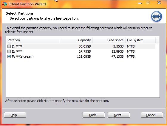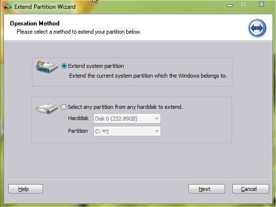 যদি C: drive এর জায়গা বাড়াতে হয় তাহলে "Extend system partition" নির্বাচন করে অথবা যদি অন্য কোন ড্রাইভ এর জায়গা বাড়াতে হয় তাহলে "Select any Partition from any harddisk to Extend" নির্বাচন করে, ড্রাইভ নির্বাচন করে নেক্সট এ ক্লিক করুন ।