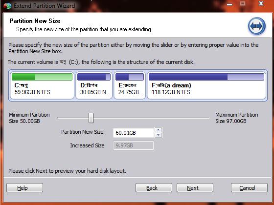 এখন যে টুকু বাড়াতে চান সে টুকু টেনে অথবা Partition New Size এর ঘরে লিখে Next এ ক্লিক করুন ।