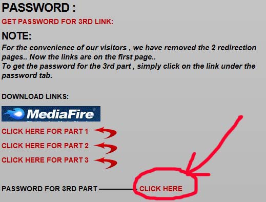 উপরের স্ক্রীনশট অনুসারে পার্ট গুলো ডাউনলোডের সময় কিছু কিছু ক্ষেত্রে কোন একটি পার্ট ডাউনলোড করতে পাসওয়ার্ড চাইবে সেক্ষেত্রে ২নং স্ক্রীনশট টি দেখুন। ২নং স্ক্রীনশট এর উপরের দিকে কোন পার্ট এর জন্য পাসওয়ার্ড লাগবে তা বলা হবে এবং ঐ পার্ট এর পাসওয়ার্ড পাওয়ার জন্য ২নং স্ক্রীনশট এর নিচের দিকে CLICK HERE (তীর চিহ্নের মাধ্যমে দেখানো হয়েছে) লেখাটিতে ক্লিক করুণ। পাসওয়ার্ড পেয়ে যাবেন।
