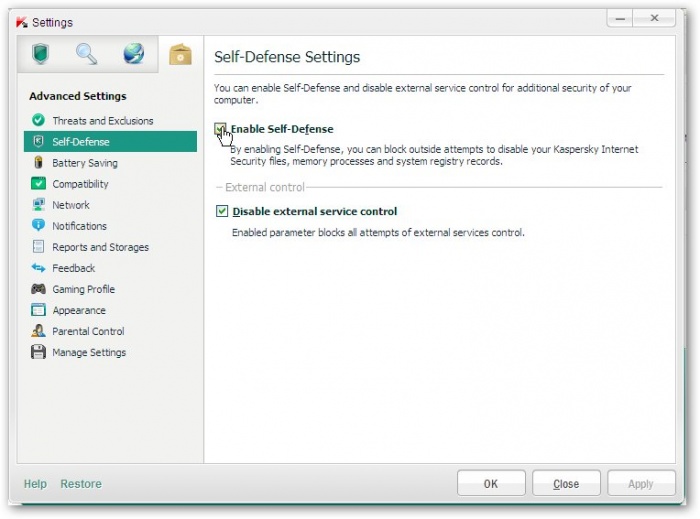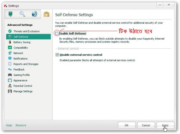 ১. প্রথমে Settings এ যান এবং Self-Defense এর টিক উঠান। Apply then OK করুন।
