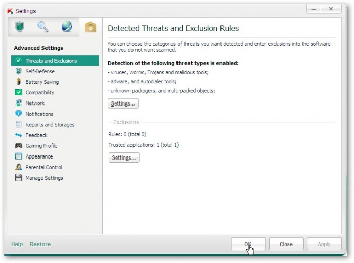 এখানে বলে রাখা ভালো যে ক্যাস্পারস্কির ট্রায়াল এবং ফুল ভার্সনের মাঝে কোন পার্থক্য নাই। ফুল ভার্সনের সব ফিচারই ট্রায়াল ভার্সনে ৩০দিনের জন্য পাওয়া যায়, উপরের চিত্রটি লক্ষ করুন।