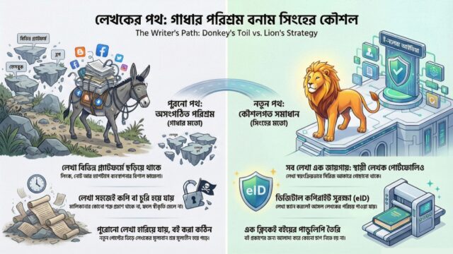 ডিজিটাল যুগে অনেক লেখক অজান্তেই ‘গাধার মতো পরিশ্রম’-এর পথ বেছে নেন, যেখানে তাদের সৃষ্টিশীলতার এক হযবরল অবস্থা তৈরি হয়। তাদের লেখাগুলো ফেসবুক, বিভিন্ন গ্রুপ এবং ওয়েবসাইটে ছড়িয়ে-ছিটিয়ে থাকে, যা লেখকের মূল্যবান বৌদ্ধিক পুঁজিকে ক্ষয় করে ফেলে। লিংক ও হ্যাশট্যাগ ব্যবহার করে সেই লেখাগুলোকে গোছানোর চেষ্টা শেষ পর্যন্ত একটি নিষ্ফল প্রয়াসে পরিণত হয় এবং কিছুদিন পরেই নতুন টিউনের ভিড়ে পুরোনো লেখা হারিয়ে যায়। লেখকের কষ্ট? কেউ আর মনে রাখে না। এর সবচেয়ে বড় দুর্বলতা হলো মালিকানার সংকট; লেখা কপি বা চুরি হয়ে যাওয়ার ভয় লেখকের মনে নিরন্তর কাজ করে এবং নিজের কাজের ওপর অধিকার প্রমাণের কোনো শক্তিশালী ভিত্তি থাকে না। প্রমাণ দেখাবে কীভাবে? এই বিচ্ছিন্ন এবং অসংগঠিত প্রচেষ্টা একজন লেখকের স্থায়ী পরিচয় তৈরিতে সবচেয়ে বড় বাধা হয়ে দাঁড়ায়, যা তার শ্রমকে স্বীকৃতিহীন করে তোলে।