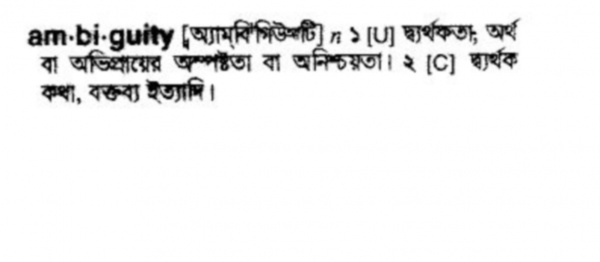 আমি বিদেশ গিয়েছি বলতে গিয়ে কেউ যদি FM রেডিওর আরজে দের মত মুখ বেকিয়ে খিঁচিয়ে বলে যে, ' আম বি গুইটি '। তাহলে আমাদের মত সাধারণ মানুষ কি তা বুঝতে পারবো ? আমরা বাক্যটি বুঝতে একটা অস্পষ্টতা অনুভব করবো না? এই ধরনের অস্পষ্টতা বা অনিশ্চয়তা কে ambiguity বলে।