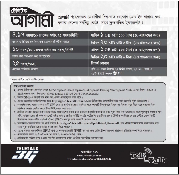 প্রতি বছরের ন্যায় এ বছর ও এসএসসি তে প্রায় ১ লক্ষ ৪৭ হাজারজিপিএ-৫ প্রাপ্ত মেধাবী ছাত্র ছাত্রীদের টেলিটক দিচ্ছে ফ্রী সংযোগ বান্ডল অফার সহ দেশের সর্বমিম্ন ট্যারিফের সুবিধা
