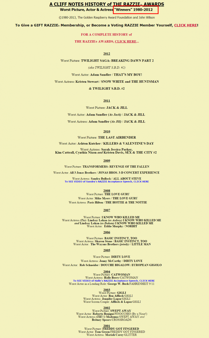 the Golden Raspberry (Razzie for short) Awards টি মূলত একটু ব্যতিক্রম। এখানে সবথেকে খারাপ মুভিগুলা দিয়েই পুরস্কার দেওয়া হয়। “dis-honors for Worst Achievements in Film since 1980.” অর্থাৎ ১৯৮০ সাল থেকে এই পুরস্কার দেওয়া হয়। সেহেতু এই Razzie-winning Films ওয়েব সাইট থেকে সব থেকে খারাপ মুভি গুলা আপনি সহজে বের করে ফেলতে পারবেন।