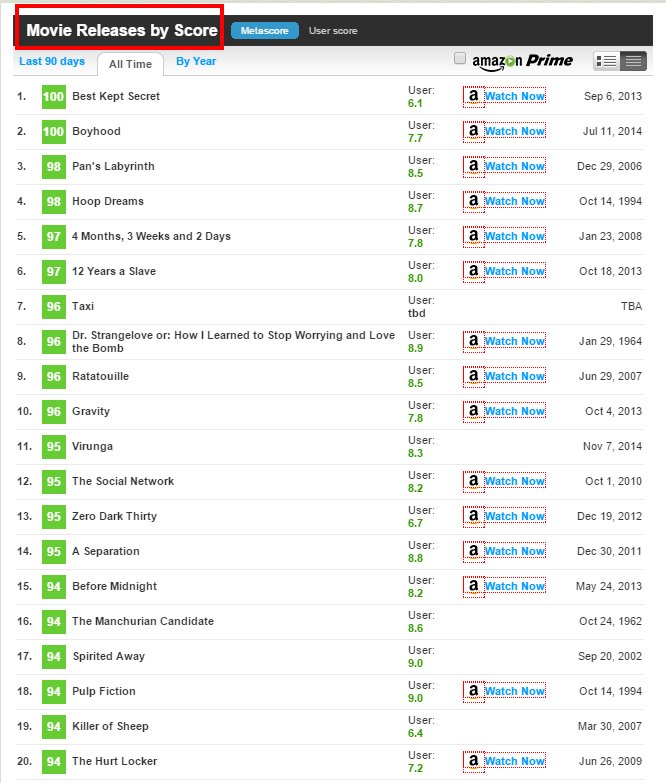 Metacritic মুভি লিস্টিং এর ক্ষেত্রে শুধু রেটিং কে গুরুত্ব দেন না, তারা রেটিং ছাড়া রিভিউ, ঘটনার সামঞ্জস্যতা ইত্যাদি বিষয়ও গুরুত্ব দেন। যেকারনে তাদের করা সব থেকে সেরা ১০০ মুভি লিস্ট খুব প্রভাব ফেলে।