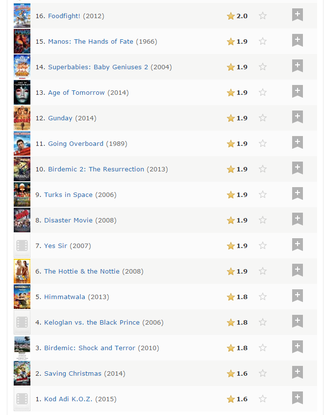 The Internet Movie Database (IMDb) সবথেকে বাজে ১০০ মুভি বা কম রেটিং মুভির একটি লিস্টও আপডেট করেন নিয়মিত।