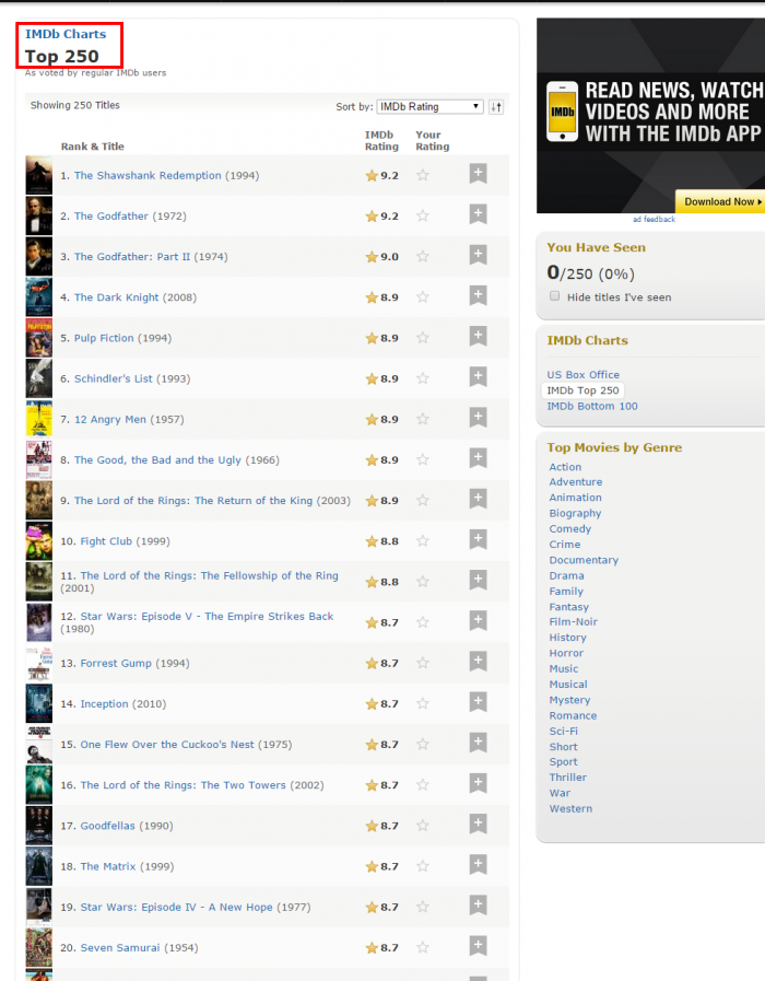 IMDb সর্বকালের সেরা ২৫০ মুভির লিস্ট আপডেট করে সব সময়। ইউজার রেটিং এর উপর ভিত্তি করে এই রেটিং করা হয়। এই রেটিং শুধু মাত্র একাউন্ট ধারি ইউজাররাই করতে পারে। সেহেতু সবার কাছে গ্রহন যোগ্যতা পায় এই The Internet Movie Database (IMDb) রেটিং গুলা। তাছাড়া আপনি একশন, কমেডি বা লাভ স্টোরি এভাবে বিভাগ ভিত্তিকও ছবি ভাগ করে ফেলতে পারেন, আর বেঁছে নিতে পারেন নিজের পছন্দ।