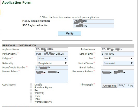 ৯. টাইপ Money Receipt Number, SSC Registration Number তারপর Verify Button এ Click করতে হবে। [ যদি আবেদনকারী জিপিএ ৩.৫ অথবা এর বেশি এবং সাধারণ গনিত অথবা উচ্চতর গনিত এ জিপি ৩ এর বেশি হয় তাহলে আবেদনকারীর বিস্তারিত তথ্য নীচে প্রদর্শিত হবে।]