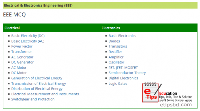 EEE Interview Tips। যারা ইলেকট্রিক্যাল এন্ড ইলেকট্রনিক্স ইঞ্জিনিয়ারিং কমপ্লিট করেছেন বা এখনও পড়ছেন, চাকরি খুজছেন তাদের জন্য আমার এই টিউন। এখানে ইলেকট্রিক্যাল এন্ড ইলেকট্রনিক্স ইঞ্জিনিয়ারিং এর বিভিন্ন বিষয়ের উপর MCQ তৈরি করেছি, যা অনেক ব্যস্ততার মাঝেও প্রযুক্তিকে কাজে লাগিয়ে সময়ের সদ্ব্যবহার করে অনলাইনে চাকরির প্রস্তুতিটা কিছুটা হলেও বাড়িয়ে নিতে পারবেন। যাইহোক আজ শুধু EEE MCQ নিয়েই আলোচনা করছি, পরবর্তীতে EEE Short Question Answer (Bangla) নিয়ে আসবো, তারপরও দুইটা বিষয়ের উপর কিছু আলোচনা করলাম। EEE ছাড়াও অন্য ইঞ্জিনিয়ারিং এর স্টুডেন্ট হলেও প্লিজ দেখে আসুন। নিচে EEE MCQ এর লিংক গুলো দিলাম