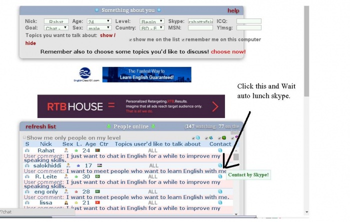 ৫.এখন আপনার স্কাইপিতে বিদেশী বন্ধুদের ফেন্ড রিকুয়িষ্ট আসতে থাকবে।যদি রেসপন্স না পান তাহলে আপনি রিকুয়িস্ট করুন যারা-বলচ্ছে I want to meet a people ডান পাশের স্কাইপের সিম্বল টিতে ক্লিক করুন (অবশ্যই স্কাইপ আপনার কম্পউটারে ইস্টল থাকতে হবে এবং লগ ইন করা থাকতে হবে.)দেখবে স্কাইপ সফটয়্যারটিতে চলে আসচ্ছে এড করুন।