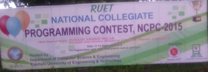 আসসালামু আলাইকুম। আমার ৯২ তম টিউনে সবাইকে স্বাগতম। রাজশাহী প্রকৌশল ও প্রযুক্তি বিশ্ববিদ্যালয়ে (রুয়েট) অনুষ্ঠিত হতে যাচ্ছে National Collegiate Programming Contest RUET NCPC 2015। Department of Computer Science & Engineering (CSE) এর উদ্যোগে 11-12 September, 2015 অনুষ্ঠিত হবে এই ইভেন্ট টি। এই প্রতিযোগিতার সহযোগী হিসেবে থাকছে বাংলাদেশ কম্পিউটার কাউন্সিল ও Ministry of Information and Communication Technology। অনলাইন মিডিয়া পার্টনার হিসেবে থাকবে campus2career24.com । উক্ত অনুষ্ঠানে প্রধান অতিথি হিসেবে থাকবে Mr. Zunaid Ahmed Palak, MP (ICT)