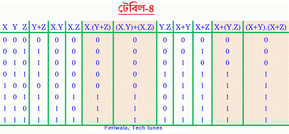 ৪। বিতরণ সূত্র X.(Y+Z)=(X.Y)+(X.Z) এবং X+(Y.Z)=(X+Y).(X+Z) প্রমাণের জন্য নিম্নের টেবিল-৪ প্রত্যক্ষ করি –