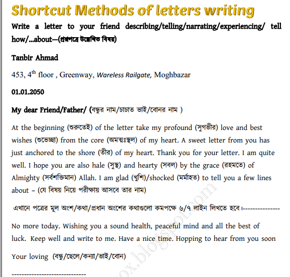 যে কোনো ইংরেজি পরীক্ষায় Part B : Written Part (40 marks) ও Composition Part (60 marks) ভালো করার জন্য সবচেয়ে সহজ পদ্বতি .!! আপনাকে আর পরীক্ষায় কমন পরা নিয়ে চিন্তা করা লাগবে না অর্থাৎ ইমারজেন্সি পরিস্থিতিতে বসে না থেকে খাতায় কিছু লিখে আসতে পারবেন। প্রায় স্টুডেন্টরা সাধারণত ইংলিশ Written Part এর টপিক্স গুলো মুখস্ত করে --!!নিজ থেকে লেখার সাহস করে না, মুখস্তবিদ্যার উপর তাদের ভরসা থাকে ফলে ইংলিশ নিজ থেকে লেখার সৃজনশীলতা কমে আসছে। তাই এই ইংলিশে যে কোন অণুচ্ছেদ লেখার শর্টকাট পদ্বতি বা ফর্মুলা গুলো আয়ত্ত করে.!! নিজ থেকে বানায় লেখার প্রবণতা বৃদ্ধি করুন .!! এবং যে কোন পরিস্থিতিতে ইংলিশ লেখার আত্তবিশ্বাস অর্জন করুন .!! [মুখস্থবিদ্যা চিন্তাশক্তিকে অকেজো করে দেয়,তাই মুখস্থকে ‘না’ বলুন এবং সৃজনশীল পদ্ধতি গ্রহণ করুন।