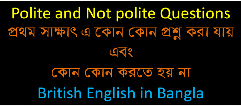 আমারা কথা তো বলতে পারি ইংলিশ এ ও পারি। আজ আমরা জানবো কিভাবে ব্রিটেনের মানুষেরা এবং কি ধরনের কথা বলতে অভ্যস্ত। প্রশ্ন হতে পারে ব্রিটেন কেন? উত্তর হল: ব্রিটিশ হল ইংলিশের রাজা (কিং) সুতরাং আমাদের জানতে হবে ব্রিটেনের ইংলিশ এর আদশ কেমন। আরেকটা কথা না বললেই নয় উনারা নিজেদের সভ্য/ভদ্র জাতি বলে দাবী করেন। তাদের দাবীটা অবশ্যই যুক্তিযুক্ত তোদের কথার ভিতর অনেক সুন্দর মাধুযতা রয়েছে রযেছে ভদ্রতা। আমার কাছে তো মনে হয় জামতলার মিষ্টর মত। যদি আপনি বুজতে পারেন। যাহোক এখন আমরা কাজের কথায় আসি তারা যখন প্রথম কারো সাথে কথা বলে মানে পরিচিত না হলে তারা কিভাবে কথা শুরু করে বা করতে হয় সেটাতো আপনারা জানেন কিন্তু আমি যেটা লতে চেষ্টা করছি সেটা হল কোন কোন বিষয়ের উপর তারা কথা বলা বা প্রশ্ন করাকে ঠিকঠাক মনে করে থাকে এবং কোন কোন কথাকে ঠিকঠাক মনে করে না বরং খ্যাত ভদ্রতা মনে করে থাকে। তারা ব্যক্তিগত কোন কথা বা প্রশ্ন করে না। তারা এটা অভদ্রতা মনে করে। এমন কোন কথা বা প্রশ্ন করে না যার উত্তর দিতে উত্তর দাতার কষ্ট হয়। ধরুন কারো সাথে কেউ কথ বলতে বলতে জানতে পারলো তার বিবহ হয়েছে ৬ বছর এথন তাকে এই প্র্শ্ন করে বসলো আপনার সন্তান কয় জন। চিন্তা করুন তার সন্তান আছে কিনা তা না জেনেই প্রশ্ন করা হল সন্তান কয় জন যদি তার সন্তান না থাকে তবে তার উত্তর দিতে কষ্ট হবে। এ ধরনের প্রশ্ন তারা করেনা বরং তারা জানে এটা ভদ্রতা। তাহলে কি ধরনের কথা দিয়ে তারা কথা বলে থাকে।আর কোন কথাগুলো পোলাইট এবং কোন কথা গুলো নট পোলাইট তা ভালো ভাবে জানার জন্য আমি একটি ভিডিও তৈরী করেছি আসলে এভাবে লিখে সব কিছু ভালোভাবে বুঝানো মুশকিল তাই এই ভিডিও দেখলেই মুটামুটি আন্দাজ করা যাবে বলে মনে হয়|