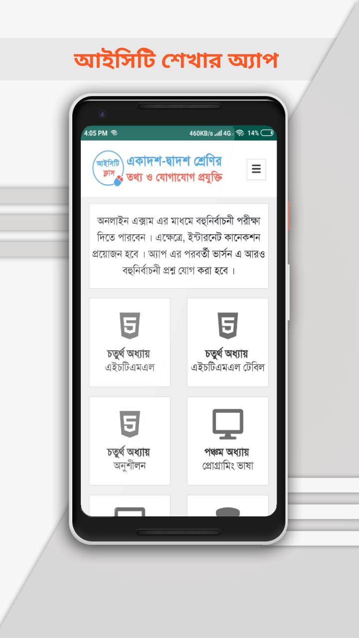 তথ্য ও যোগাযোগ প্রযুক্তি একাদশ ও দ্বাদশ শ্রেণির একটি আবশ্যিক বিষয়। এখন থেকে একাদশ-দ্বাদশ শ্রেণির শিক্ষার্থীরা ঘরে বসেই তথ্য ও যোগাযোগ প্রযুক্তি বিষয়টি শিখতে পারবে। এজন্য Play Store থেকে ICTClass অ্যান্ড্রয়েড অ্যাপটি ডাউনলোড করতে হবে। অ্যাপটি ইন্সটল করার পর আইসিটি বিষয়ের বহুনির্বাচনী প্রশ্ন প্র্যাকটিস করতে পারবেন।