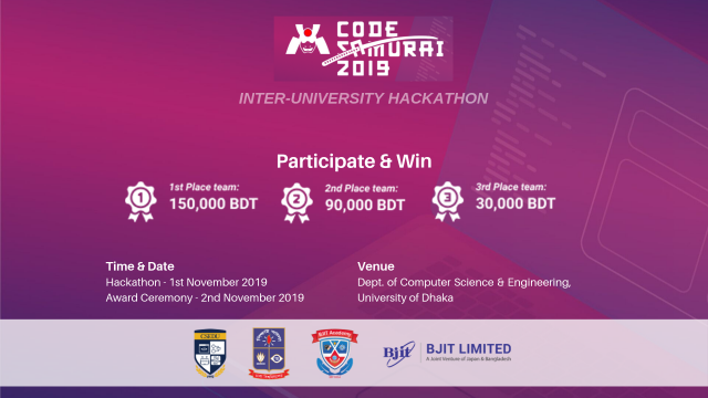 বাংলাদেশ-জাপান জয়েন্ট ভেঞ্চার কোম্পানি BJIT এবং ডিপার্টমেন্ট অফ কম্পিউটার সাইন্স এন্ড ইঙ্গিনিয়ারিং, ঢাকা বিশ্ববিদ্যালয় একদিন ব্যাপী হ্যাকাথন Code Samurai 2019 এর আয়োজন করতে যাচ্ছে। হ্যাকাথনটি ঢাকা বিশ্ববিদ্যালয়ের কম্পিউটার সাইন্স এন্ড ইঙ্গিনিয়ারিং ডিপার্টমেন্টে অনুষ্ঠিত হবে। রেজিস্ট্রেশন প্রক্রিয়া ইতঃমধ্যে শুরু হয়েছে এবং ১৫ ই অক্টোবর হচ্ছে রেজিস্ট্রেশনের শেষদিন। ১ লা নভেম্বর হ্যাকাথন এবং ২ রা নভেম্বর পুরষ্কার বিতরণী অনুষ্ঠান অনুষ্ঠিত হবে।