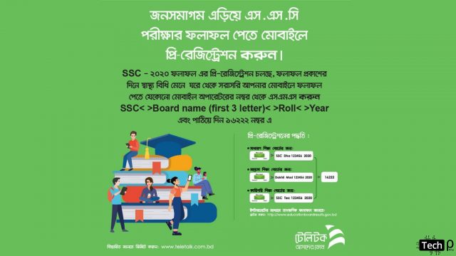 এসএসসি এবং সমমানের ফলাফল সম্পর্কে জানতে, প্রাক-নিবন্ধকরণ ফলাফল প্রকাশের ২৪ ঘন্টা আগে অবধি চলবে। প্রাক-নিবন্ধন করতে আপনার মোবাইলের মেসেজ অপশনে গিয়ে SSC/Dakhil <স্পেস>Board<স্পেস>Rool No:<স্পেস>Year লিখে পাঠিয়ে দিন ১৬২২২ নাম্বারে।