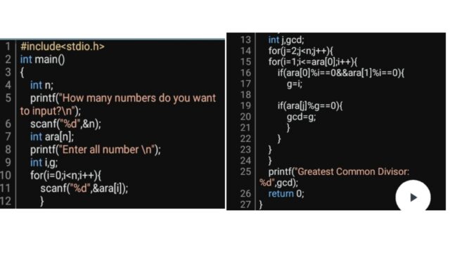 আজ আমি সি প্রোগ্রামিং দিয়ে কিভাবে অনেকগুলো সংখ্যার গ.সা.গু নির্ণয় করা যায় তা শেয়ার করব৷ আমাদের বইয়ে (ইন্টারমিডিয়েট) দেখেছেন যে সেখানে do - while লুপ দিয়ে দুটি সংখ্যার গসাগু নির্ণয় করার কোড দেওয়া আছে৷ কিন্তু আমি চিন্তা করেছিলাম কিভাবে do while লুপ ব্যবহার না করে দুটি সংখ্যার গসাগু নির্ণয় করা যায়৷ for loop দিয়ে সফল হলাম৷ এরপর চিন্তা করলাম দুটি না করে তিনটি সংখ্যার গুসাগু নির্ণয় করা যায় কিনা৷ তাও আলহামদুলিল্লাহ সফল হয়ে গেলাম৷ এরপর চিন্ত্রা করলাম অনেকগুলো সংখ্যার গসাগু নির্ণয় করব কিভাবে? এটাতেও অনেক সময় ব্যয়ের পরে সফল হলাম৷ আজ আমার সেই চিন্তাগুলোই শেয়ার করছি৷ হয়তো এই ট্রিকগুলো আপনাদেরও কাজে লাগতে পারে৷ পরীক্ষায় যদি do while loop না এসে বলে for loop দিয়ে করতে তাহলেও এটা কাজে লাগতে পারে৷ [আর মনে করবেন না আমাদের অটোপাশ দিয়ে দিবে৷ আমাদের বেচের অটোপাশ দেওয়ার সম্ভাবনা একেবারেই কম৷ অর্থাৎ আমাদের পরীক্ষা ঠিকই হয়ে যাবে]