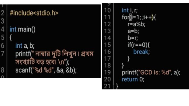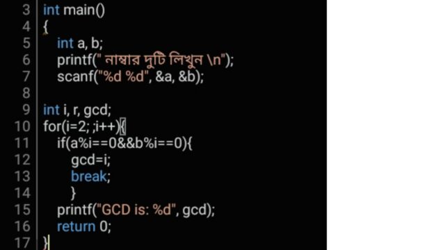 আমি a এবং b দুটি সংখ্যা নিয়েছি৷ আপনি ইচ্ছা করলে এ ওয়েতে অনেকগুলো সংখ্যা নিতে পারেন এবং && দিয়ে প্রত্যেকটাতে শর্ত দিয়ে গসাগু বের করতে পারেন৷ যেমন আপনি যদি a, b & c তিনটা সংখ্যা নিন তাহলে আপনি আপনি লুপের ভিতর এরকম শর্ত লিখতে পারেন-