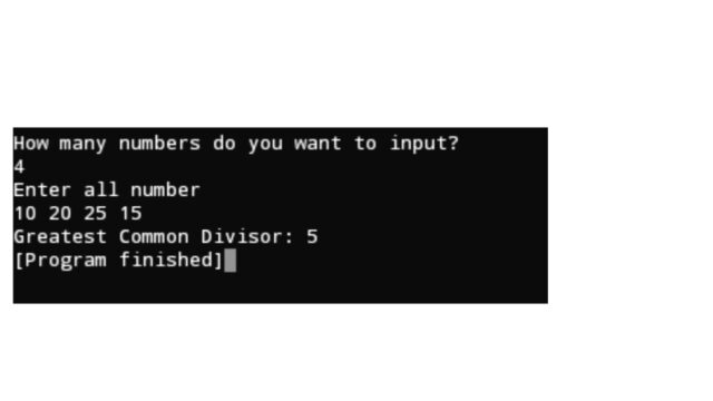 এর মাধ্যমে বলে দিয়েছি g এর যেসব সংখ্যা পাওয়া যাবে সেগুলো দ্বারা array এর সবগুলো সংখ্যা ভাগ করে দিব৷ যে সংখ্যাটি দ্বারা array এর সবগুলো সংখ্যা ভাগ করা যাবে সেটাই হবে গসাগু৷ এভাবে সহজেই আমরা অনেকগুলো সংখ্যা থেকে গসাগু বের করে ফেলতে পারব আর ব্যবহারকারীর এন্টার দেওয়ার সাথে সাথেই প্রোগ্রাম বলে দিবে গসাগু কত৷