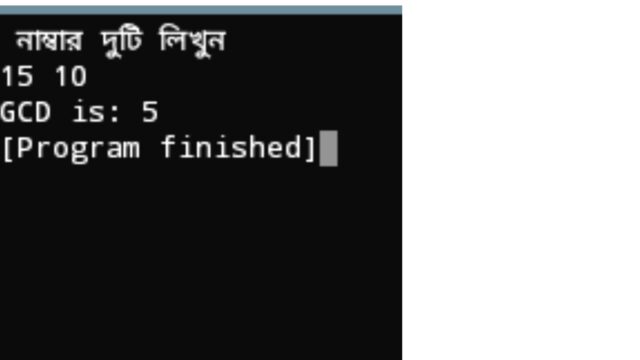 যদি দুটি সংখ্যা 15 আর 10 নিই তাহলে 5 দিয়ে 15 ভাগ যাবে এবং ভাগশেষ 0 হবে এবং 5 দিয়ে 10 ও ভাগ যাবে এবং ভাগশেষ 0 হবে৷ লুপের ভিতর আমি এই শর্তই বলেছি৷