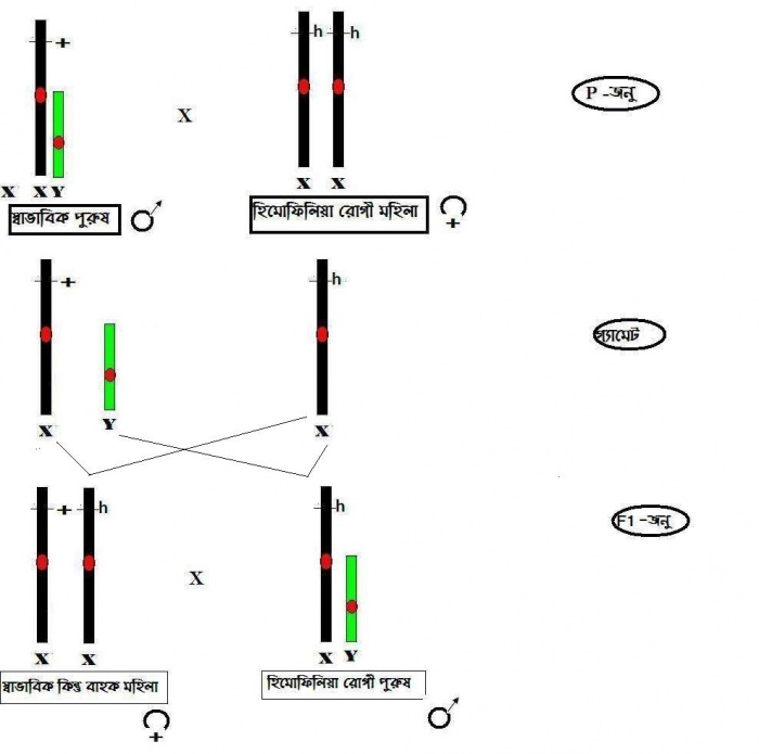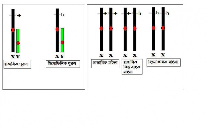 | Xh | X+ Xh স্বাভাবিক মহিলা কিন্তু বাহক | Xh Y হিমোফিলিয়া রোগগ্রস্ত পুরুষ | |