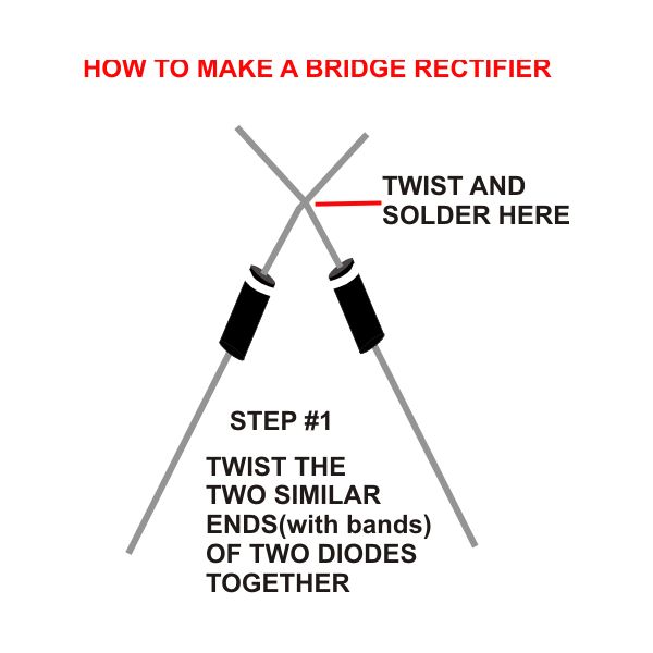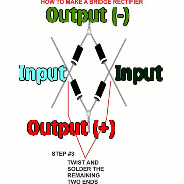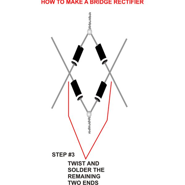 সার্কিটটি সম্পর্কে হয়ত সবাই জানেন! এটি হল চারটা রেকটিফায়ার ডায়োডের ব্রিজ কানেকশন! প্রথমে যেকোন মানের চারটা রেকটিফায়ার ডায়োড সংগ্রহ করুন! তবে ডায়োড যত মোটা হবে তত ভাল! এবার নিচের চিত্রের মতো তিনটা ধাপে ব্রিজ কনেকশন তৈরী করুন.