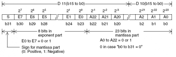 অনুরূপ, বৈজ্ঞানিক নোটেশন ফর্ম্যাটের মতই, এই বিন্যাস নম্বর প্রদর্শন করে D রেজিস্টার এবং D+1 রেজিস্টারে। অংশক সমস্ত D এর 16 বিট এবং D+1 এর প্রথম 7 বিট দখল করে। সুচক D+1 এর শেষের 9 বিট, সাথে 15 বিট চিহ্নিত বিট হিসাবে কাজ সম্পাদন করে।
