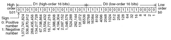 আগেই বলেছিলাম, ইন্টিজার হল ডিফল্টরূপে 16 বিট। যখন কিছু কমান্ড, পরে আলোচনা করা হবে বলা হয়, এবং সেটি যখন ব্যবহৃত হয়, তখন এটা 32 বিট সংখ্যা হওয়ার সম্ভাবনা থাকে। যখন এটা করা হয়, তখন পিএলসি দুটি 16 বিট রেজিস্টারকে একটি বৃহৎ রেজিস্টার হিসাবে দেখে। 15 বিট MSB হিসাবে আর গণ্য হয় না। পিএলসি এখন বিবেচনায় 32 বিট হিসাবে MSB কে গণ্য করবে। পিএলসি এই পূর্ণসংখ্যার প্রদর্শন করতে -2,147,483,648 থেকে 2,147,483,647 পরিসীমার মধ্যে থাকবে। (শুধুমাত্র বৈজ্ঞানিক নোটেশন ব্যবহার ব্যতীত, নিচে দেখুন)