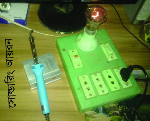 ৪। সোলডারিং আয়রন পরীক্ষাঃ- সোলডারিং আয়রন সকেটে প্রবেশ করালে বাল্ব হাল্কা জ্বলবে । তাহলে সোলডারিং আইরন ঠিক আছে । যদি বাল্ব না জ্বলে তাহলে সোলডারিং আয়রন এ সমস্যা আছে । সোলডারিং আইরন ব্যবহার করার সময় সিরিজ বোর্ড ব্যবহার করা ভালো । এতে সোলডারিং আয়রন অতিরিক্ত হিট হয়না ।