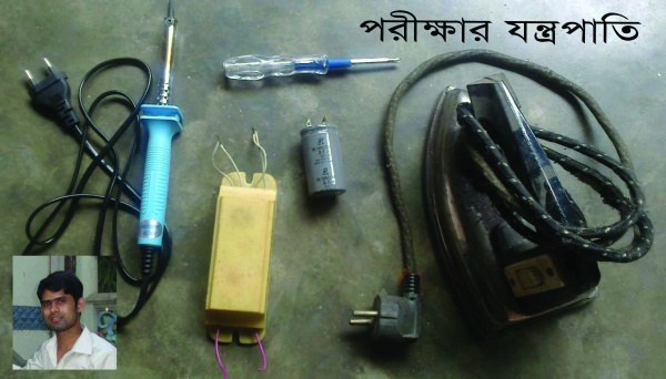 . ১। ইলেকট্রিক তারঃ- তারে কোন ফলট আছে কিনা পরীক্ষা করতে , তারে দুই মাথা টুপিন সকেটের দুই ছিদ্রে প্রবেস করান। দেখবেন বাল্বতি জ্বলছে । তাহলে তার ঠিক আছে । যদি বাল্ব না জ্বলে তাহলে তারে সমস্যা আছে ।