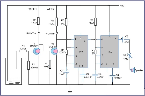 এখন আসি আসল কথায় । কিভাবে এটি কাজ করবে ? আগেই বলেছি পানি একটি কন্ডাক্টর হিসেবে কাজ করে । আর তাই যখন পানি উপরের তার টি ছুঁয়ে ফেলে তখনি দুটো তার শর্ট হয়ে যায় এবং T1 Transistor BC 547 এ একটি ইনপুট ভোল্ট পায় এবং পয়েন্ট A হাই হয়ে যায় কিন্তু পয়েন্ট B cutoff হয়ে যায় যা পরের T2 Transistor BC 547 এ র ইনপুটে গিয়ে একে চালু করে । পরবর্তীতে এই ভোল্টেজ প্রথম ৫৫৫ টাইমারে যায় যেটা পরের ৫৫৫ টাইমারের রিসেট পিনে ইনপুট হিসেবে গিয়ে হাই Frequency আউটপুট দেয় । এবং এরি মাধ্যমে স্পিকার এ একটি শক্তিশালি ভোল্টেজ যায় যার ফলে স্পিকার বেজে উঠে এবং আপনিও বুঝে জাবেন যে পানি ভরে গেছে । আবার ঠিক একি ঘটনা যদি পানি কমতে কমতে একেবারে নিচে নেমে যায় । ঠিক তখনি আপনি হয় সুইচ অন করবেন অথবা অফ করে দিবেন । এটা হচ্ছে একেবারে বেসিক কথা বার্তা । এবার আসি লজিকাল কিছু কথা ।