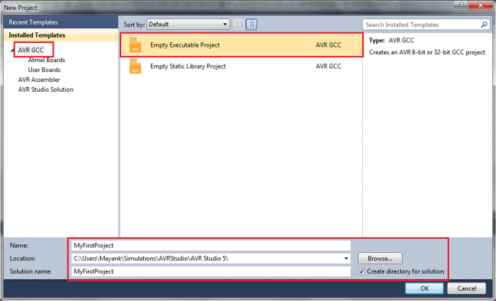 এর পর যে উইন্ডো আসবে , সেখান থেকে AVR GCC নির্বাচন করুন। এরপর Empty Executable Project নির্বাচন করুন। এর পর প্রজেক্টের জন্য যেকোন একটা নাম দেয়া যেতে পারে, যেমন MyFirstProject। এর পর হার্ডডিস্কের কোন লোকেশনে প্রজেক্টি সেভ হবে তা দেখিয়ে দিতে হবে।Create directory for solution চেকবক্সে টিক চিহ্ন দিয়ে OK বাটনে ক্লিক করতে হবে।