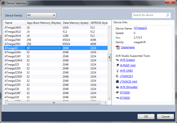 এরপর ডিভাইস নির্বাচনের জন্য একটা ডাইলোগ বক্স দেখা যাবে, যেখানে AVR Studio 5 সাপোর্ট করে এ ধরণের সকল মাইক্রোকন্ট্রোলার সমূহ দেখা যাবে। এখান থেকে আমরা যে ডিভাইসের জন্য প্রোগ্রাম লিখতে চাচ্ছি তা নির্বাচন করে দিতে হবে। যেমন ATmega32। এরপর OK বাটনে ক্লিক করতে হবে।