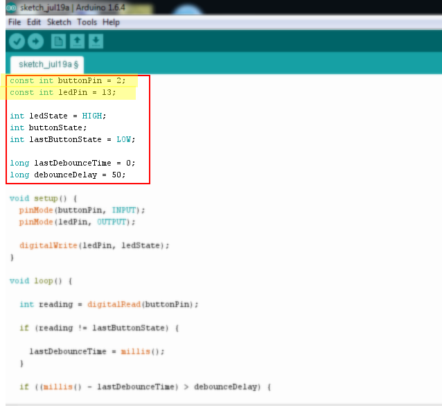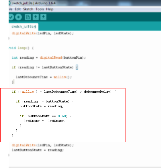 if ((millis() - lastDebounceTime) > debounceDelay) এর ক্ষেত্রে আমরা প্রথমে বিবেচনা করি যে প্রোগ্রামটি রান হওয়ার ঠিক ৫০০ মিলি সেকেন্ড পর সুইচটি প্রথম Close করা হয়েছিলো, তাহলে lastDebounceTime=500। এক্ষেত্রে millis() এর ভ্যালু যখন 551 হবে তখন if ((millis() - lastDebounceTime) > debounceDelay) এর কন্ডিশন সত্য হবে এবং if এর কন্ডিশনাল স্টেটমেন্টস কার্যকর হবে।