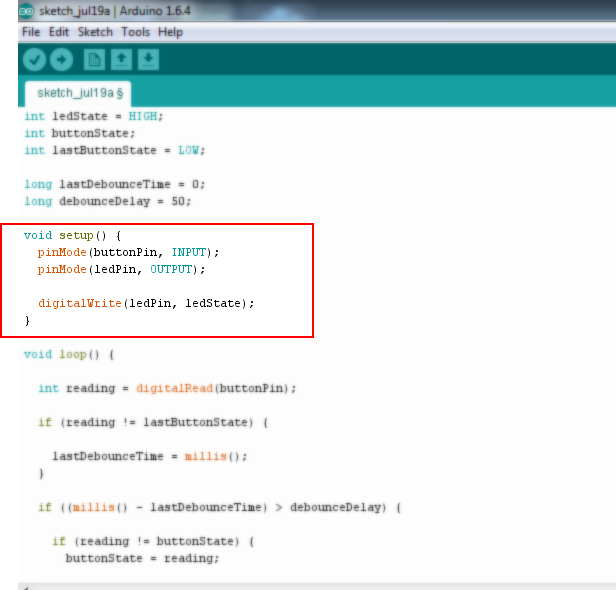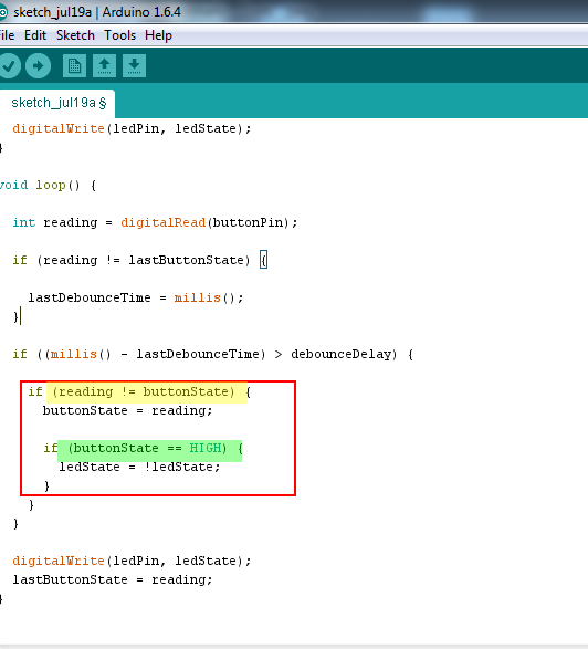 যদি buttonState == HIGH হয় তাহলে ledState = !ledState; হবে বা টগোল করবে, অর্থাৎ আগে HIGH থাকলে LOW হবে বা উল্টা ঘটনা ঘটবে।।