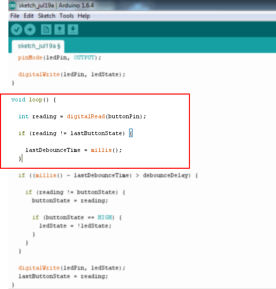lastDebounceTime = millis(); এখানে millis() ফাংশনের কাজ হলো যখন প্রোগ্রামটি রান হওয়া শুরু হবে তখন থেকে একটা কাউন্টার চালু হবে এবং মিলিসেসেন্ডে ভ্যালু দেবে। lastDebounceTime = millis(); এর মাধ্যমে কাউন্টারের মিলিসেসেন্ড ভ্যালুকে lastDebounceTime ভেরিয়েবলে জমা রাখবে।