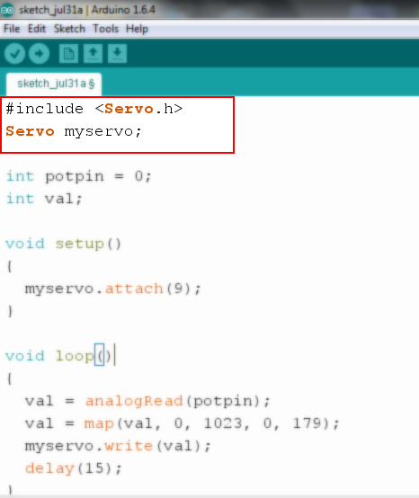 Servo myservo; এর মাধ্যমে Servo মোটরটি কন্ট্রোল করার জন্য myservo নামে একটা Object তৈরি করা হয়েছে।