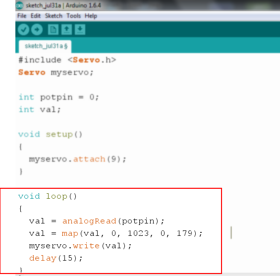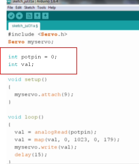 val = analogRead(potpin); এর মাধ্যমে পটেনশোমিটার থেকে ভোল্টেজের ভ্যালু রিড করে 0 থেকে 1023 রেন্জের মধ্যে একটা এনালগ ভ্যালু তৈরি করে, যা val ভেরিয়েবলের মাধ্যমে জমা থাকে। val = map(val, 0, 1023, 0, 179); এর মাধ্যমে 0 থেকে 1023 রেন্জের এনালগ ভ্যালুকে রিস্কেল করে 0 থেকে 179 রেন্জের মধ্যে আনা হয়। এক্ষেত্রে Servo মোটরটি কত ডিগ্রী এঙ্গেলে ঘুরবে তা val ভেরিয়েবলের মান নির্দেশ করে।