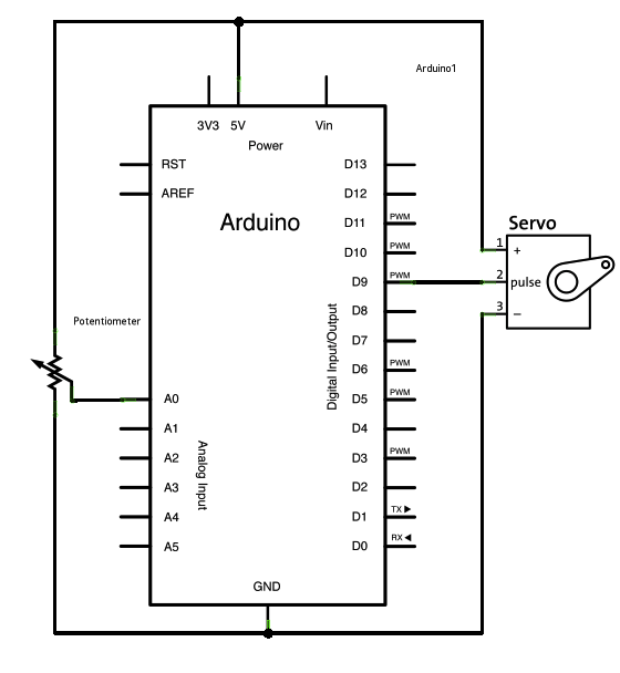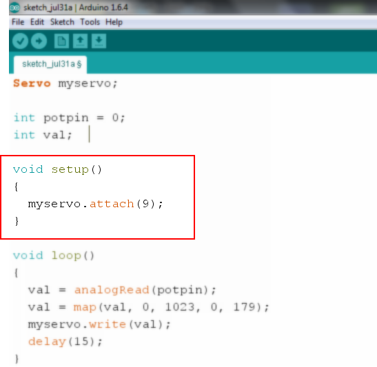 void setup() { myservo.attach(9); } এর মাধ্যমে ৯ নং ডিজিটাল ইনপুট আউটপুট পিনকে Servo মোটরের সিগন্যাল ওয়্যারের জন্য নির্ধারণ করা হয়েছে।