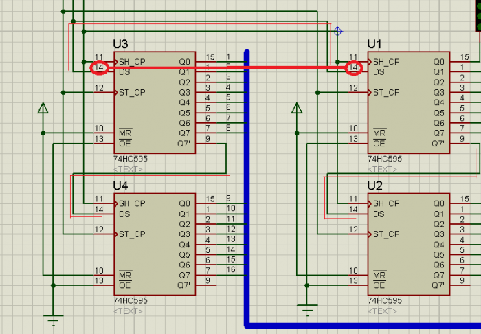 আবার, নিচের ১ম এবং ২য় ম্যাট্রিক্স এর কলাম 74HC595 এর সাথে সরাসরি সংযোগ করা হয়েছে। কিন্তু উপরের ম্যাট্রিক্স দুটোর কলাম লেবেলিং করে 74HC595 এর সাথে সংযোগ করা হয়েছে। মূলত উপরের এবং নিচের ম্যাট্রিক্স একসাথে করার জন্য লেবেলিং করে সংযোগ করা হয়েছে।